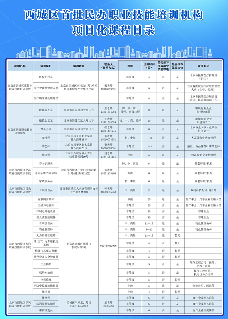 近年来,西城区积极寻访金融科技、养老护理、城市保障等辖区急需、紧缺的产业技能培训资源,指导培训机构落地地理信息应用操作、医疗护理员、消防设施操作员等职业培训项目,新设培训机构4家,培训项目11项。同步指导11家优质培训机构开发了49项“岗位需求+技能培训+技能评价+就业服务”的项目化技能培训课程,在微信公众号技能照亮前程专题专区发布,区域培训机构的培训内容得到进一步充实优化。